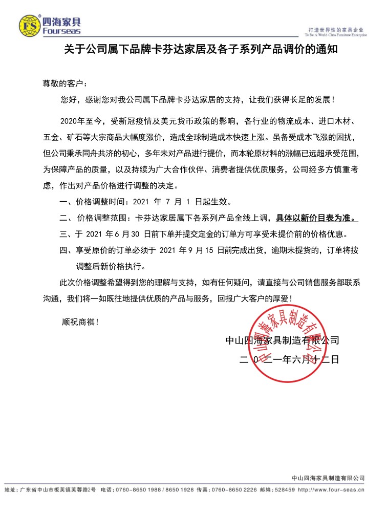 關(guān)于公司屬下品牌卡芬達家居及各子系列產(chǎn)品調(diào)價的通知